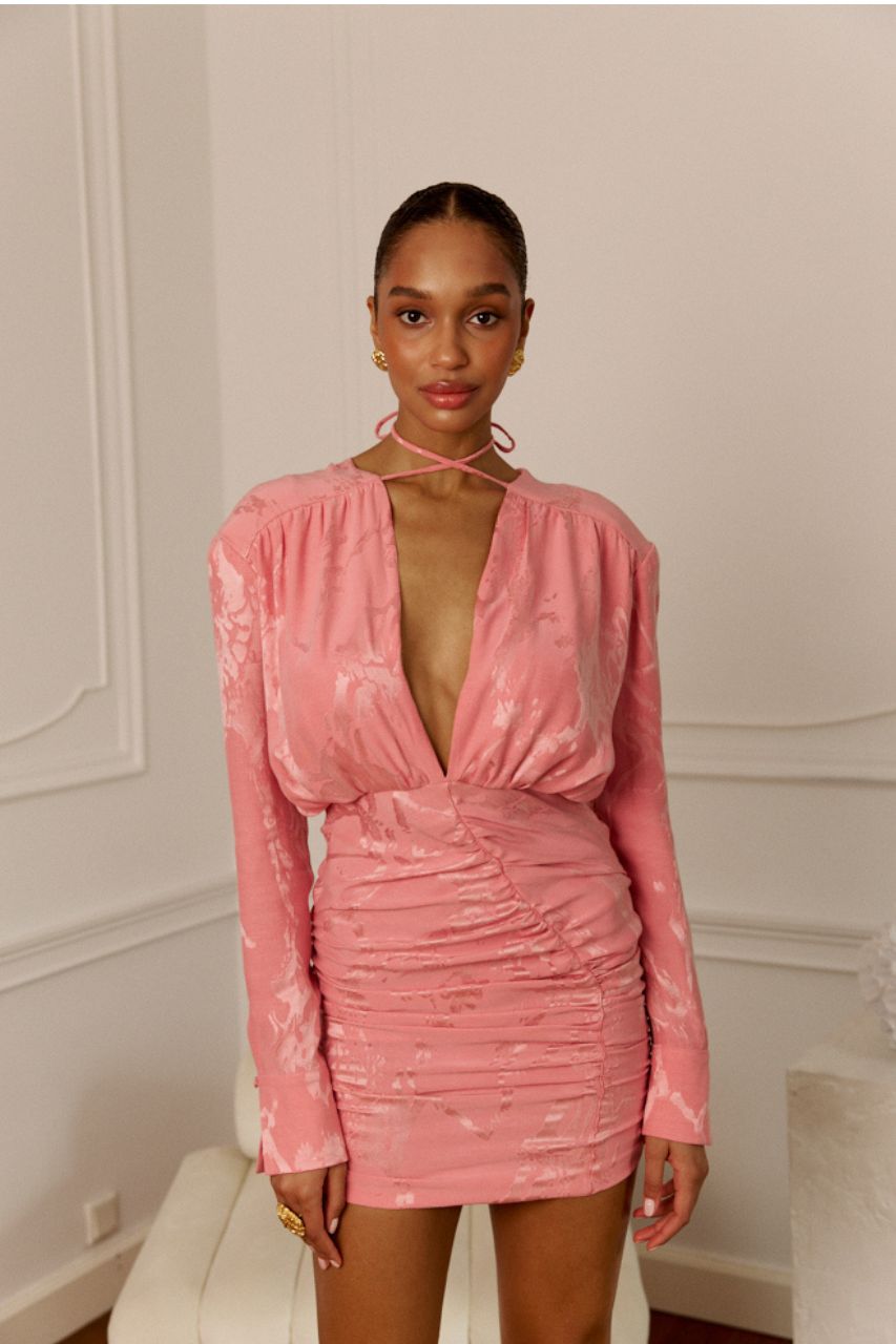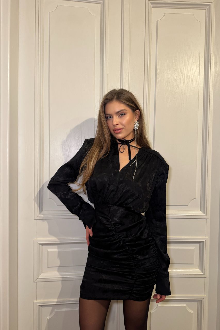 Zmysłowa, efektowna i kobieca sukienka wykonana z czarnej żakardowej tkaniny w print kwiatowy łączy kobiecy urok z romantycznym charakterem. Sukienka posiada głęboki dekolt, jednak na wysokości biustu jest ukryta haftka, którą można zapiąć i uzyskać tylko delikatny dekolt. Ramiona podkreślone są poduszkami , które zamocowane są na springi i można je łatwo odpiąć. Sukienka w części spódnicy posiada dopasowany krój, który podkreśla sylwetkę. W przedniej części spódnicy widoczne jest niesymetryczne marszczenie, spódnica marszczona jest również po bokach i w tylnej części przez środek. Bluzka ma luźna formę, rękawy są proste zakończone mankietem i zapinane na jeden guzik. Bluzka w przedniej części wykończona jest podszewka. Wiązanie pod szyją dodaje uroku.